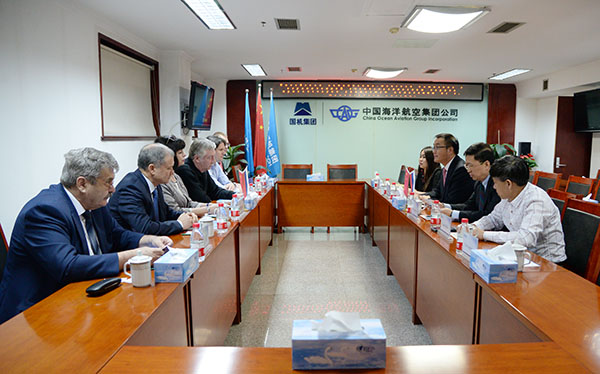 The vice chairman of China Ocean Aviation Group Limited (COAG), Yan Weihong, and the vice general manager, Ma Jinchang, met with Andre Petrovich, the Mayor of zhukovskiy, Russian, in Beijing on March 30, to exchange views on cooperation.